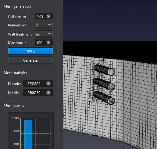 In CFxD, the default local refinement is applied to boundary names that contain “wall”. For this reason, “wall” was used in the pipe naming. The large tank surfaces were named “tank”, so refinement was not applied to them.