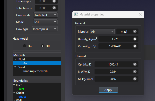 - The materials library includes several common fluids and gases. You can also add a custom material in the dialog.